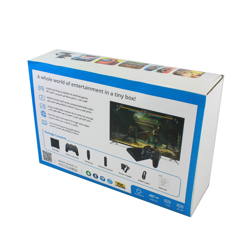 بر روی این کنسول چند بازی اندرویدی و شبیه ساز کنسول نوستالژیک سوپر نینتندو و مجموعه ای از بهترین بازی های آن مانند سوپر ماریو، سونیک، مورتال کامبت و ... به صورت پیش فرض نصب است. برای نصب بازیهای بیشتر میتوان از گوگل پلی، کافه بازار یا سایر مارکتهای اندرویدی استفاده نمود. در این کنسول بازی اندرویدی میتوان مانند تمامی اندرویدباکس ها از قابلیت های نمایش فیلم، وب گردی و نرمافزارهای سرگرمی و آموزشی اندروید استفاده نمود.