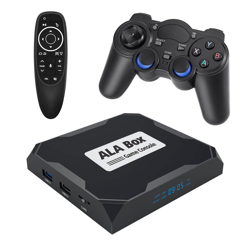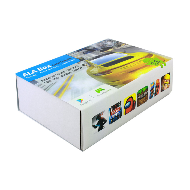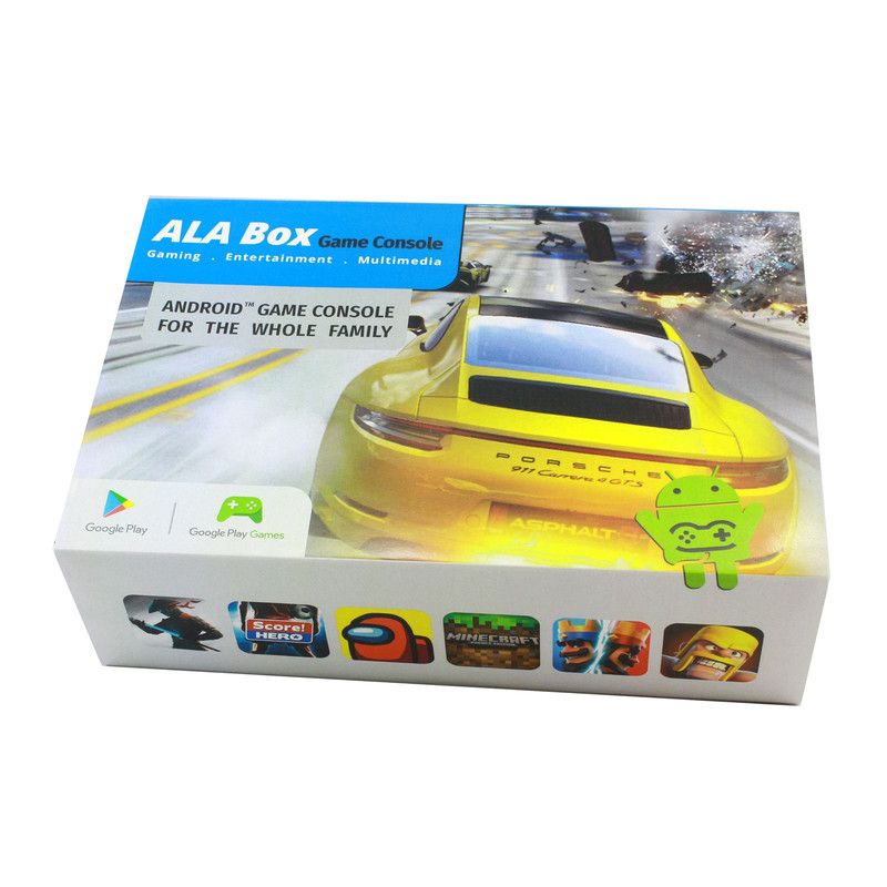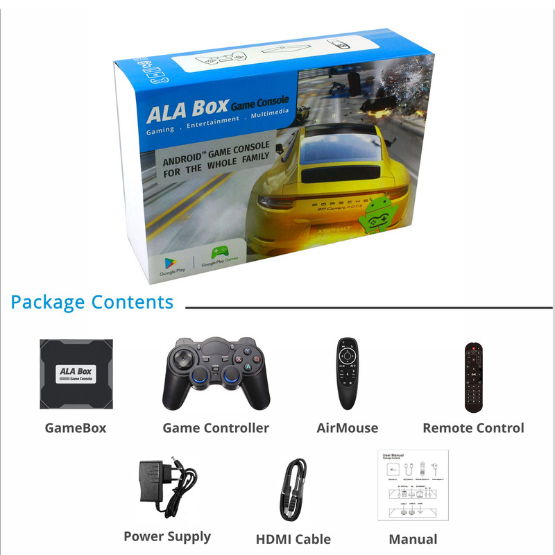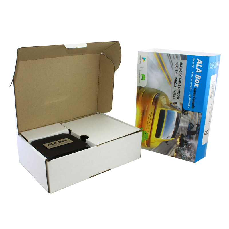 کنسول بازی آلاباکس شامل یک کنسول اندرویدی، یک دسته بازی بی سیم و یک ایرماوس است. این کنسول با داشتن سیستم عامل اندروید میتواند هزاران بازی اندرویدی را با کیفیت فوق العاده 8K بر روی مانیتور و یا تلویزیون شما اجرا نماید. کنسول بازی آلاباکس از قویترین پردازنده (Amlogic S905x) موجود در بازار استفاده مینماید و از حافظه رم 4 گیگابایت و حافظه داخلی 32 گیگابایت بهره می برد. این کنسول دارای دو درگاه USB2.0 و USB3.0 است و از کارت حافظه microSD تا ظرفیت 128 گیگابایت پشتیبانی مینماید. همچنین برای پخش با کیفیت صدای خروجی دستگاه یک پورت AV و یک پورت اپتیکال بر روی بدنه آلاباکس جانمایی شده است. برای راحتی کار یک Airmouse فوق العاده با نور پس زمینه همراه کنسول وجود دارد که با تکان دادن مچ دست نشانگر موس روی صفحه تلویزیون حرکت میکند. همگام سازی دسته و کنسول با استفاده از دانگل USB میباشد.