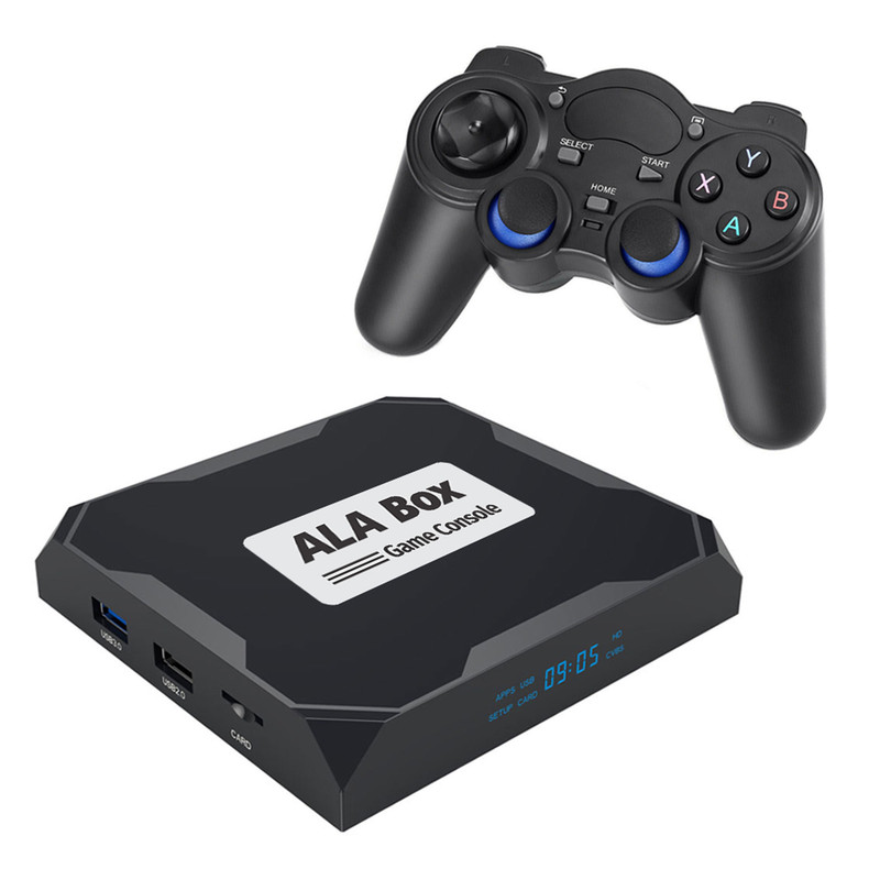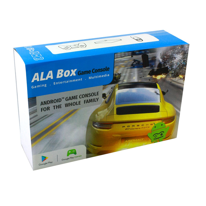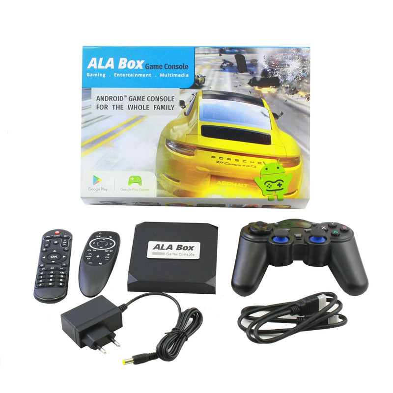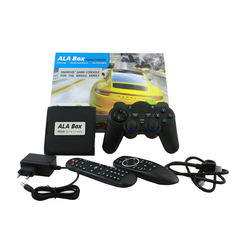 کنسول بازی آلاباکس شامل یک کنسول اندرویدی، یک دسته بازی بی سیم و یک ایرماوس است. این کنسول با داشتن سیستم عامل اندروید میتواند هزاران بازی اندرویدی را با کیفیت فوق العاده 8K بر روی مانیتور و یا تلویزیون شما اجرا نماید. کنسول بازی آلاباکس از قویترین پردازنده (Amlogic S905x) موجود در بازار استفاده مینماید و از حافظه رم 4 گیگابایت و حافظه داخلی 32 گیگابایت بهره می برد. این کنسول دارای دو درگاه USB2.0 و USB3.0 است و از کارت حافظه microSD تا ظرفیت 128 گیگابایت پشتیبانی مینماید. همچنین برای پخش با کیفیت صدای خروجی دستگاه یک پورت AV و یک پورت اپتیکال بر روی بدنه آلاباکس جانمایی شده است. برای راحتی کار یک Airmouse فوق العاده با نور پس زمینه همراه کنسول وجود دارد که با تکان دادن مچ دست نشانگر موس روی صفحه تلویزیون حرکت میکند. همگام سازی دسته و کنسول با استفاده از دانگل USB میباشد.